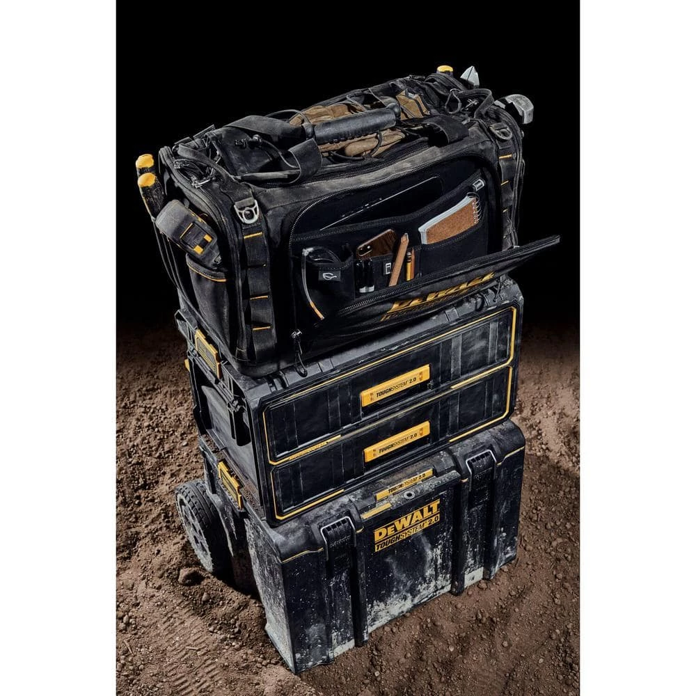Get spacious vertical storage with the ToughSystem 2.0 Jobsite Tool Bag. This bag features over 50 pockets, and a top bungee cord that allows for vertical storage of large power tools, hand tools, and other jobsite necessities. The Jobsite Tool Bag can be accessed from any side for maximum convenience. The durable 1680D fabric, dirt-repellent material, and waterproof base make this bag suitable for any work environment. The bag can be stacked with any ToughSystem 2.0 product.