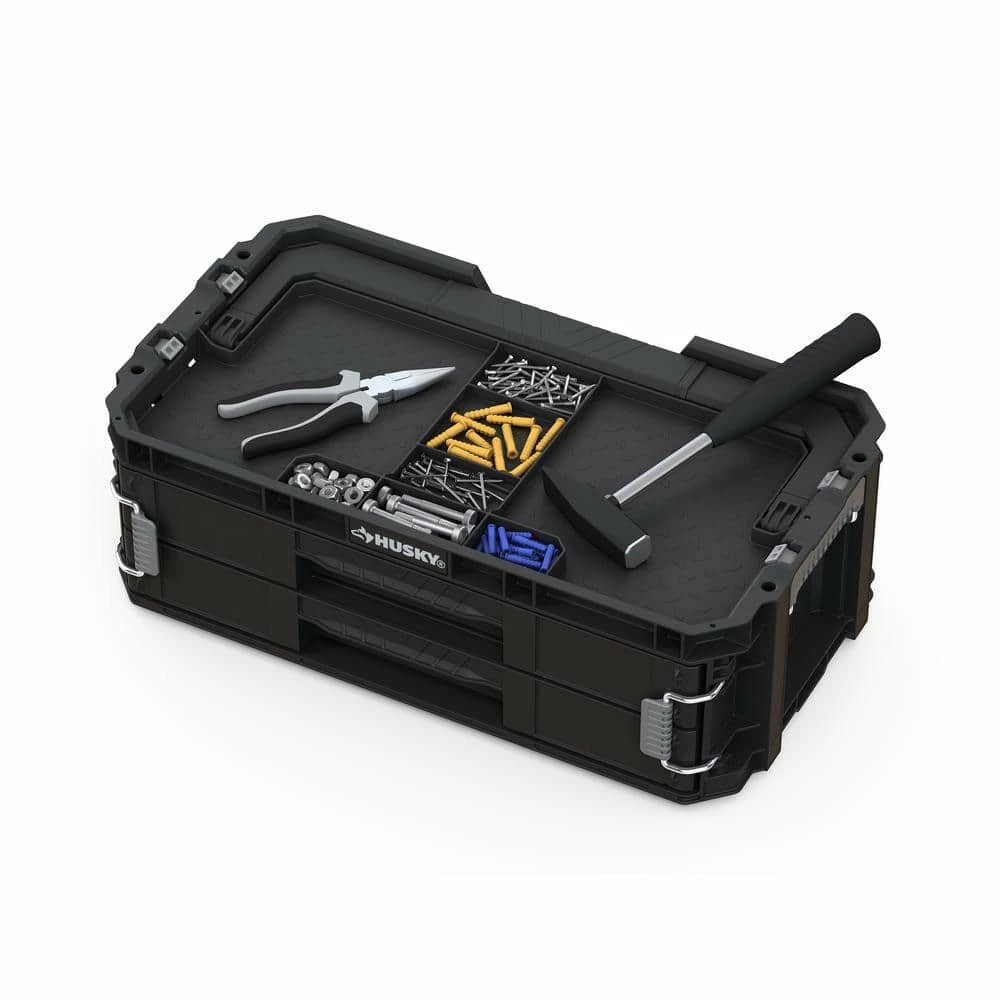 At home or on the go, the Husky 22 in. Connect Drawer offers an ideal way to keep small tools, parts, and craft accessories neatly organized. A smart choice for DIYers or crafters, it offers 2 fully extendable slide-out drawers for quick and easy access to all your items. It has removable dividers in one of the drawers so you can customize how you organize. Designed for portability, this organizer features a comfortable full-length handle and front metal latches that keep contents securely in place when transported. The Husky 22 in. Connect Drawer can be easily stacked on to the 22 in. Husky Connect Rolling System, providing you with a complete multi-functional mobile tool and accessories storage solution.