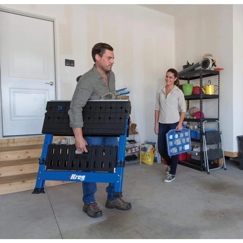 The Mobile Project Center is a workbench, sawhorse, assembly table and clamping station all in one – a versatile workspace for DIY, repair and woodworking projects. It’s easy to set up and store away and it provides a sturdy platform for all kinds of project tasks. Plus, the Mobile Project Center Includes $40 worth of bonus clamping accessories, so it’s ready to go to work, right out of the box. The Mobile Project Center provides a portable workspace that can be used for a wide variety of project tasks. In one mode, it’s a sturdy sawhorse that’s great for supporting long boards as you cut. Flip the large tables into position and this product offers the features you’d expect to find in a high-end stationary workbench. The clamp trak and included bench clamp with automax auto-adjust technology provide multiple ways to hold work pieces. The open tables can support up to 350 lbs. (158 kg) and have built-in storage trays, holsters for your drill and more. A shelf underneath holds up to 25 lbs. (11.3 kg) of supplies and tools out of the way but close at hand while you work. Whether you are drilling pocket holes, clamping cases or face frames together or preparing your project for final assembly, the Mobile Project Center makes Kreg Joinery even easier. You can even add a 2×4 cutting surface using the included hardware. Flip one or both tables into position and the Mobile Project Center is ready to take on many other tasks.