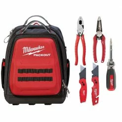 - Kit includes: one 48-22-8301 15 in. PACKOUT backpack, one 48-22-1503 fastback folding utility knife with blade storage and compact folding utility knife with 2 general purpose blades (2-pack), one 48-22-3079 7.75 in. combination electricians 6-in-1 wire strippers pliers, one 48-22-6100 9 in. H leverage lineman’s pliers with crimper, and one 48-22-2880 13-in-1 multi-tip cushion grip screwdriver