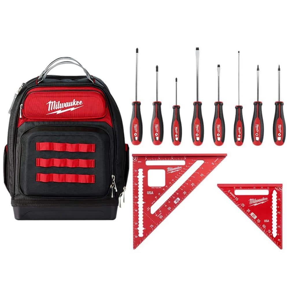 - Includes: (1) 48-22-8201 Ultimate Jobsite Backpack, (1) MLSQ070P 7 in. Rafter Square & 4-1/2 in. Trim Square Set, and (1) 48-22-2718 Screwdriver Set (8-piece)